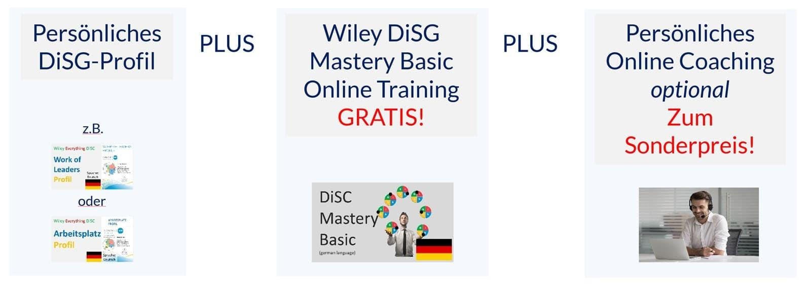 Sie suchen sich ein persönliches DiSG-Profil aus und im weiteren Bestellverauf bekommen Sie gratis das online Training "Wiley DiSG Mastery Basic Training" dazu und können wahlweise optional das persönliche Expertencoaching dazunehmen.