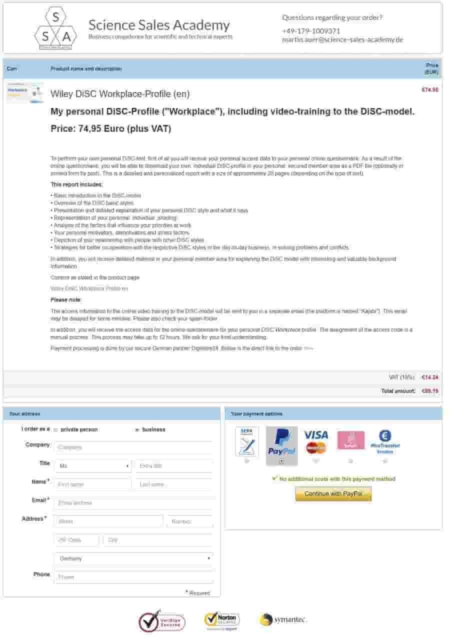 To perform your own personal DiSC-profile, first of all you will receive your personal access data to your personal online questionnaire. As a result of the online questionnaire, you will be able to download your own, individual DiSC-profile in your personal, secure member area as a PDF file (optionally in printed form by post). This is a detailed and personalized report of 23 pages.