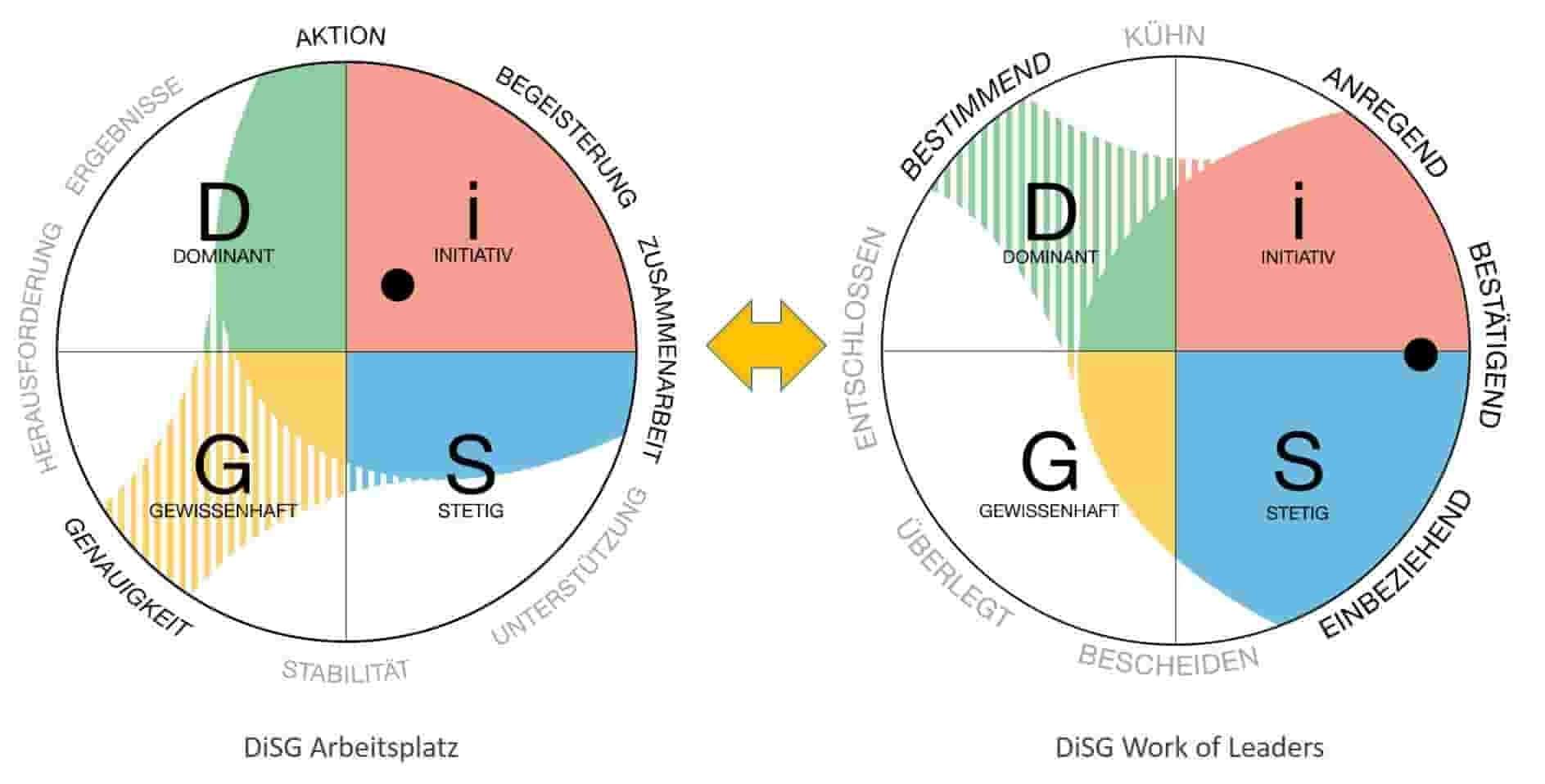 Zum Vergleich (Bild oben): Bereits die individuellen DiSG-Profile sind mit den acht Begrifflichkeiten klar auf den Bereich Führung ausgerichtet. Beispiel: "Aktion" im Arbeitsplatzprofil wird im Work of Leaders ersetzt durch "Kühn". Genauso "Herausforderung" vs. "Entschlossen", usw..